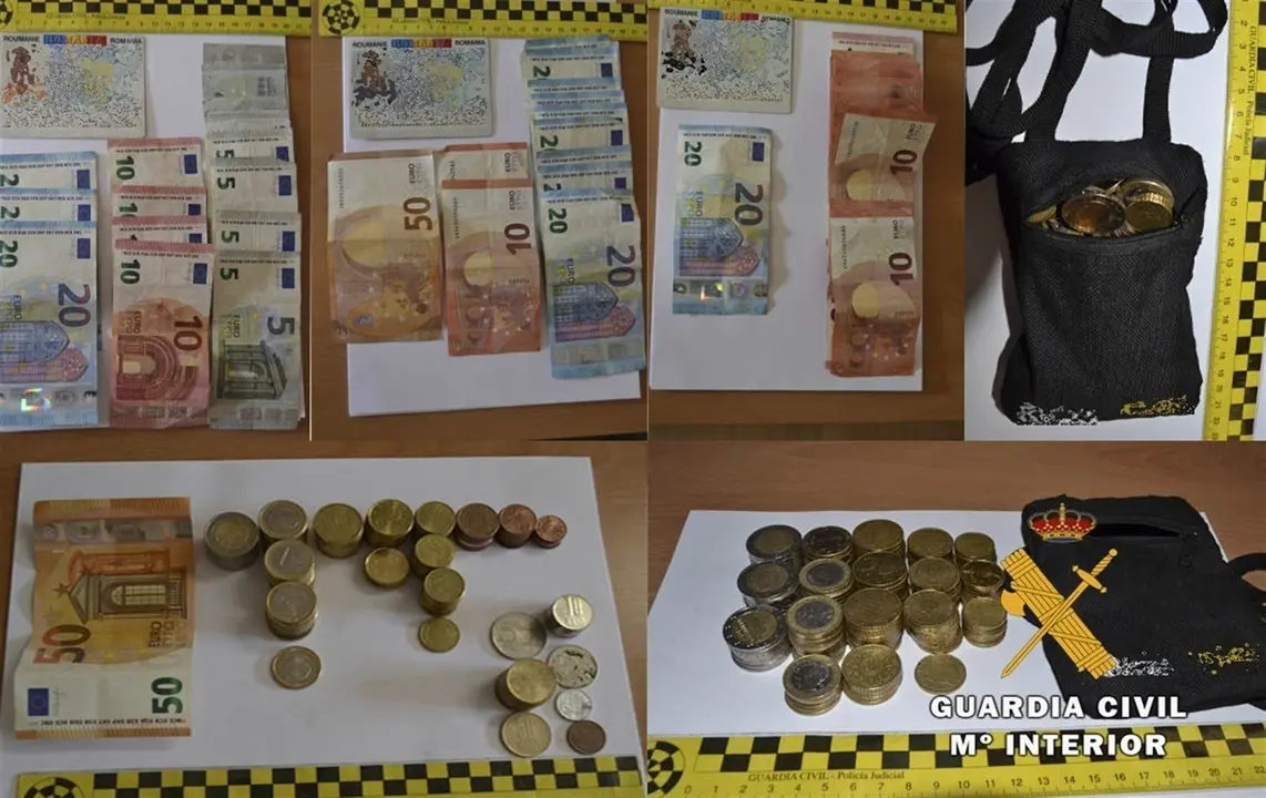 A cada uno de los ocupantes se les hallaron diferentes billetes, y dentro del vehículo más de 200 monedas, coincidente todo ello con la cantidad sustraída. Además, en el maletero se encontraron efectos de los utilizados para la comisión de delitos contra el patrimonio, como ropa oscura de ocultación, herramientas y linterna, entre otros.