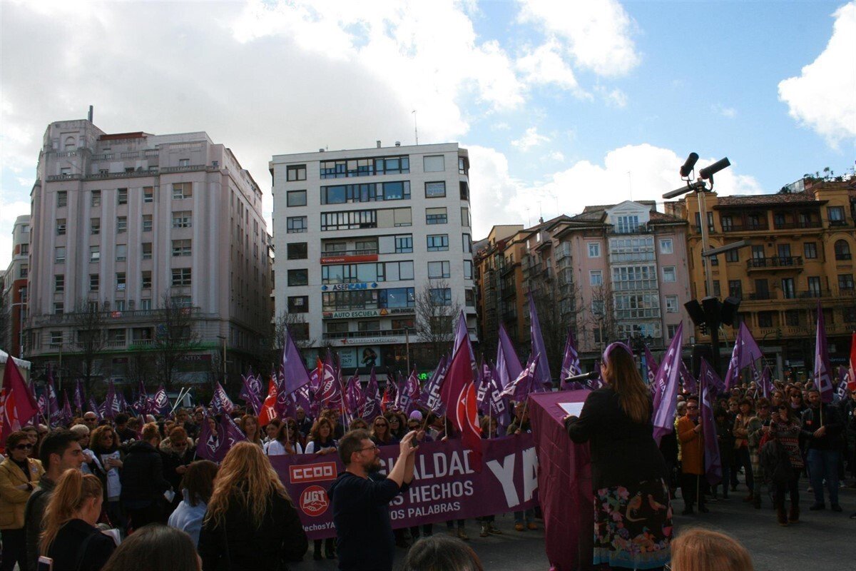 "Queremos igualdad ya. Más hechos y menos palabras. Es un gran éxito que nos hayamos colado en la agenda política", han subrayado las responsables de Mujer e Igualdad de ambos sindicatos, Rosa Mantecón y Asunción Villalba, durante la concentración que se ha celebrado en la plaza del Ayuntamiento.