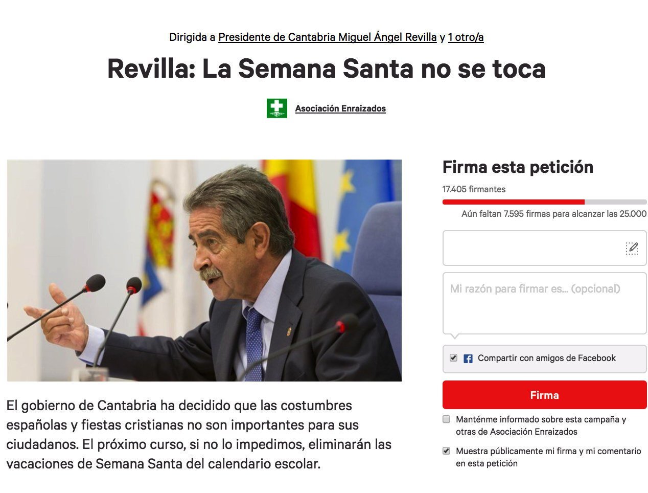 Una campaña en change.org ha recogido en diez días 17.350 firmas contra la supresión de las vacaciones escolares de Semana Santa el próximo curso en Cantabria, al mantenerse -con cambios- el modelo implantado este año académico en la región, que distribuyen las clases en cinco bimestres separados por cuatro periodos de descanso y los meses de verano.