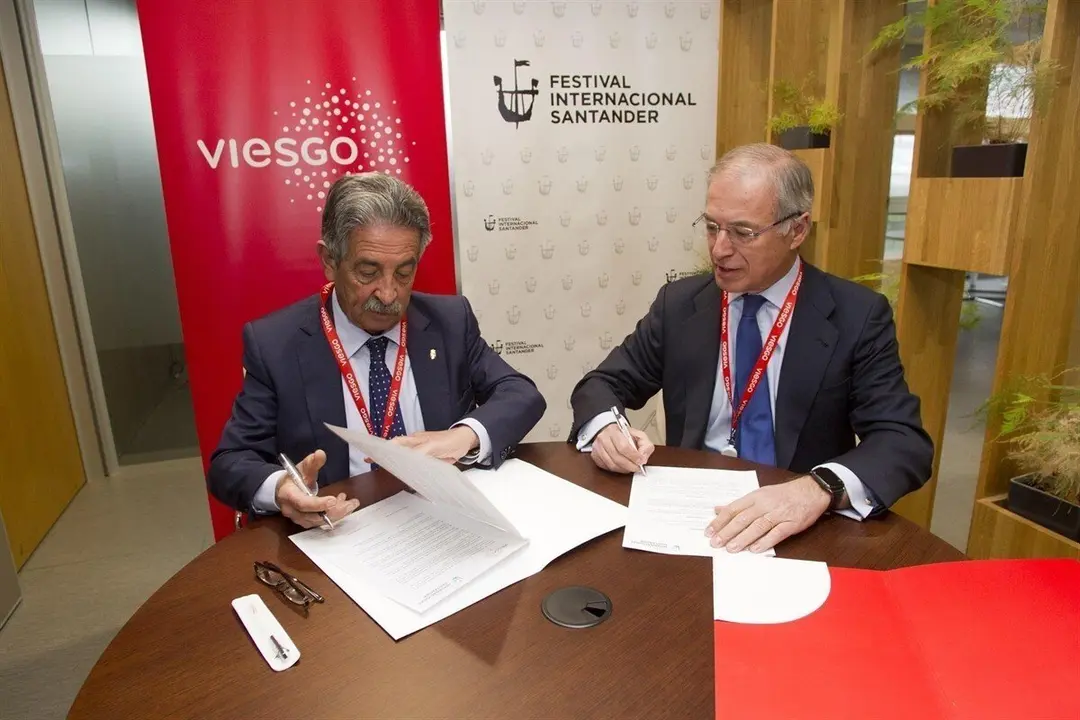 El presidente del Patronato del FIS, Miguel Ángel Revilla, y el presidente de Viesgo, Miguel Antoñanzas, han firmado un nuevo acuerdo para patrocinar uno de los grandes conciertos sinfónicos de las dos próximas ediciones del festival.