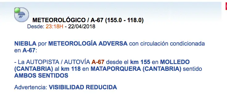 La Dirección General de Tráfico advierte de que en estos momentos la circulación está condicionada por la niebla en la autovía A-67 entre las localidades cántabras de Molledo (pk 155) y Mataporquera (118), en ambos sentidos.