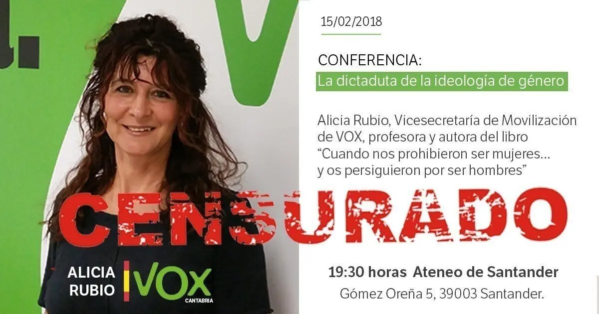 En un comunicado, VOX ha recordado que el Ateneo difundió el 15 de febrero una nota de prensa en la que anunciaba la cancelación de la conferencia de su vicesecretaria de Comunicación, Alicia Rubio titulada 'La dictadura de la ideología de género'.