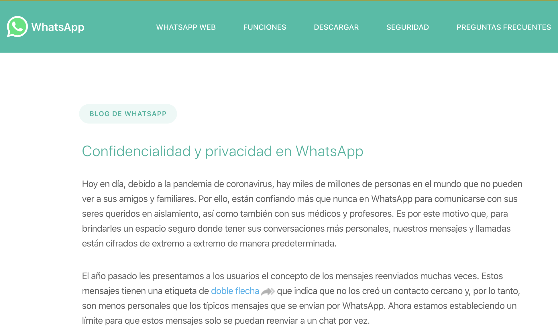 Creemos que ahora más que nunca las personas necesitan poder comunicarse de manera privada. Nuestros equipos están trabajando arduamente para que WhatsApp siga funcionando de manera confiable durante esta crisis mundial sin precedentes. Continuaremos escuchando tus comentarios y mejorando las formas en que las personas comparten contenido entre ellas en WhatsApp.