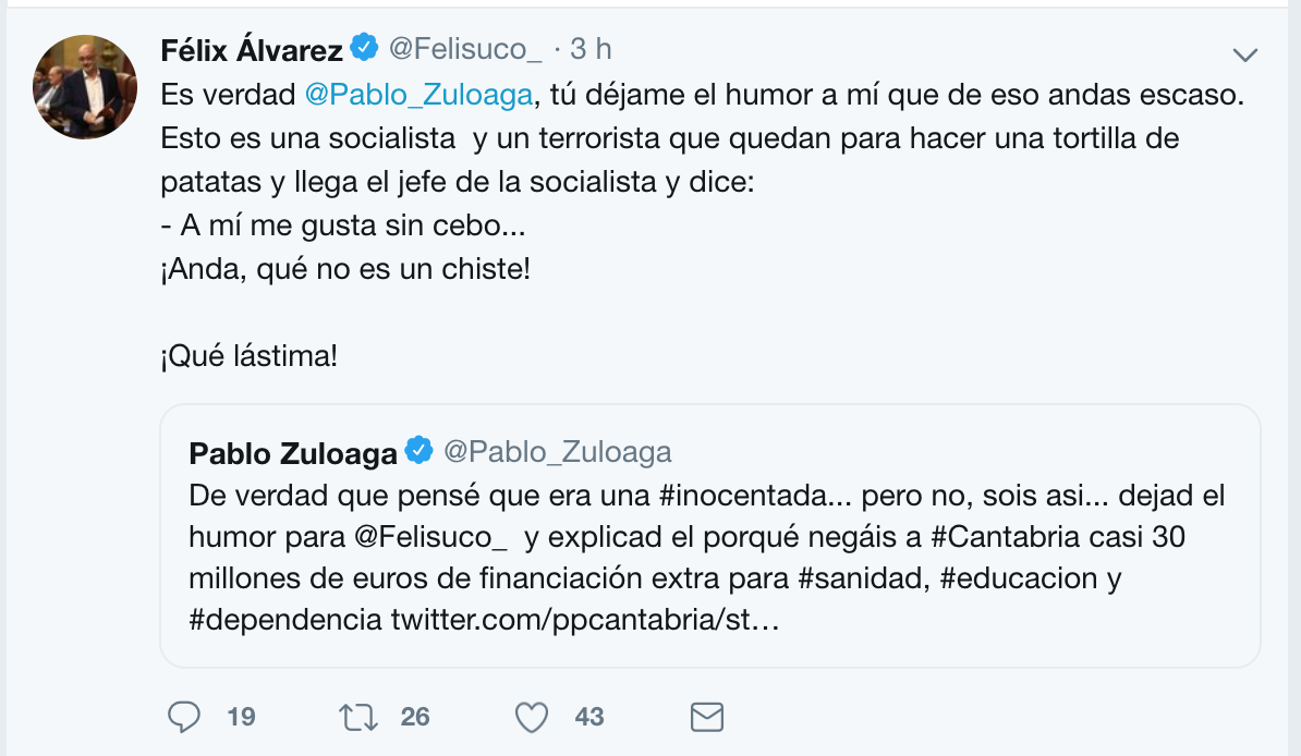 Félix Álvarez: "Es verdad @Pablo_Zuloaga, tú déjame el humor a mí que de eso andas escaso. Esto es una socialista y un terrorista que quedan para hacer una tortilla de patatas y llega el jefe de la socialista y dice: - A mí me gusta sin cebo... ¡Anda, qué no es un chiste! ¡Qué lástima!"
