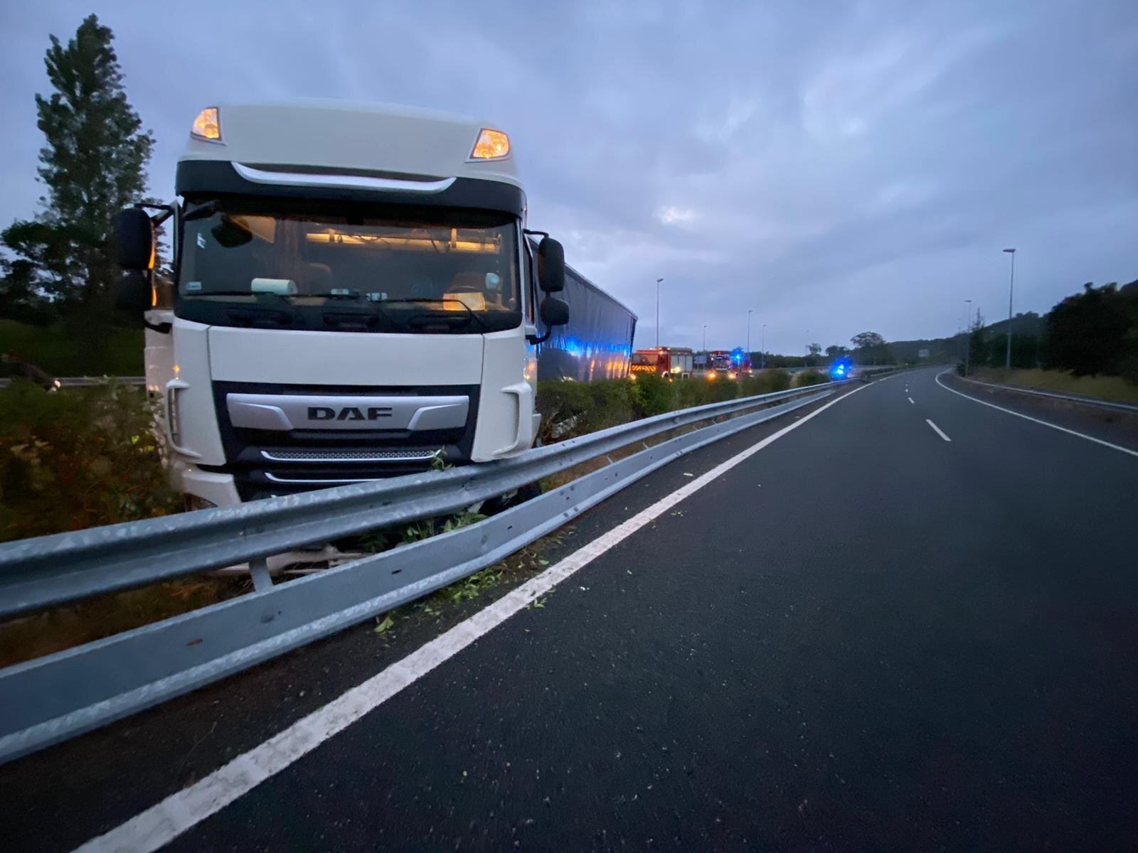 Según informa el Centro de Gestión de Emergencias 112 de Cantabria, el camión se salió de la vía en el kilómetro 269, sentido Oviedo. El vehículo, que transportaba cemento, arrancó varios metros de vionda. Los bomberos del 112 controlaron el derrame de aceite y lo inertizaron.