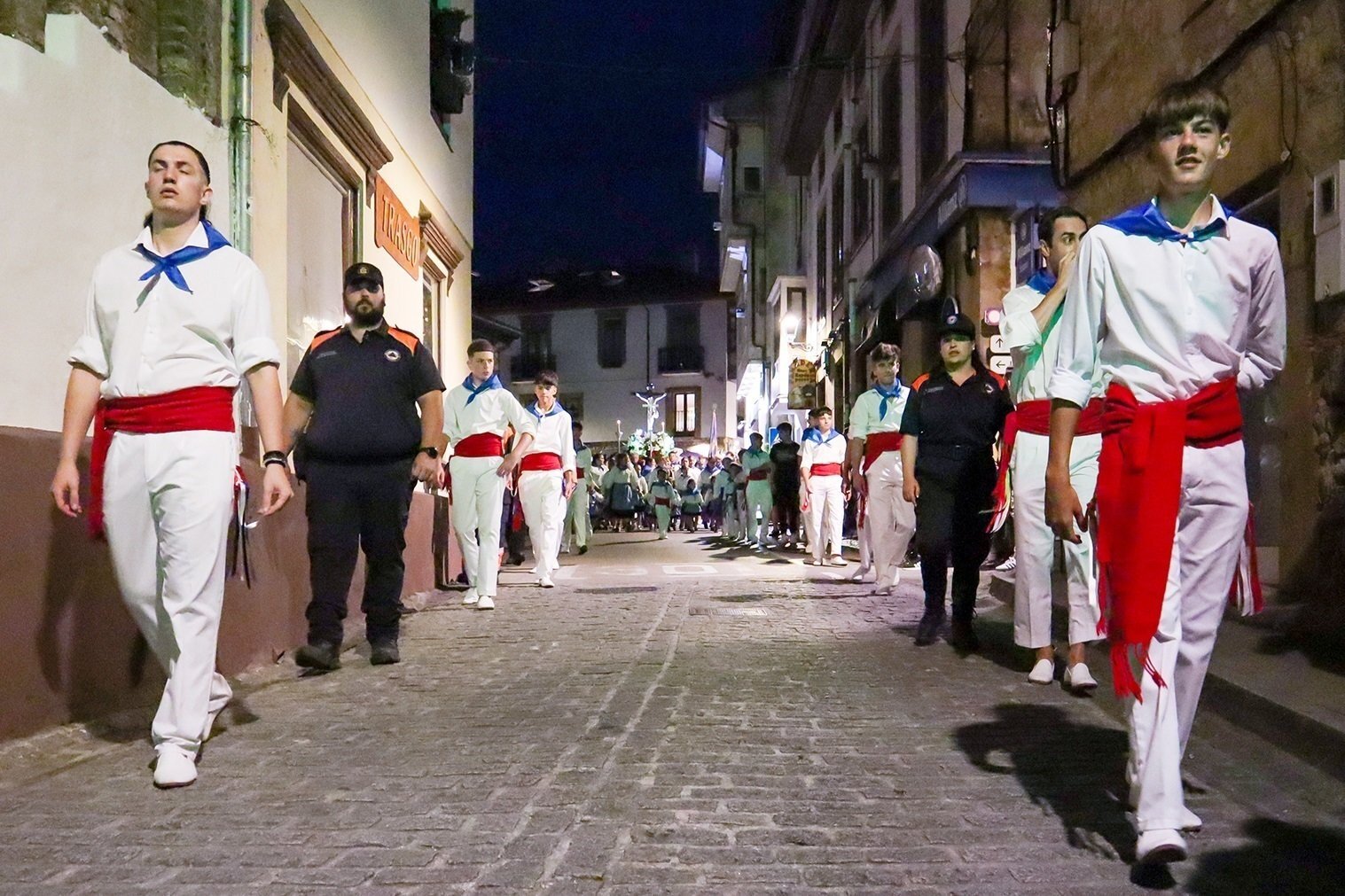 Cerca de un millar de personas han acompañado la bajada del Santo Cristo del Amparo desde la iglesia parroquial hasta el muelle de Comillas, junto a banda de banda de gaitas Gediu de Los Corrales de Buelna y la danza de picayos y pandereteras de la villa marinera.