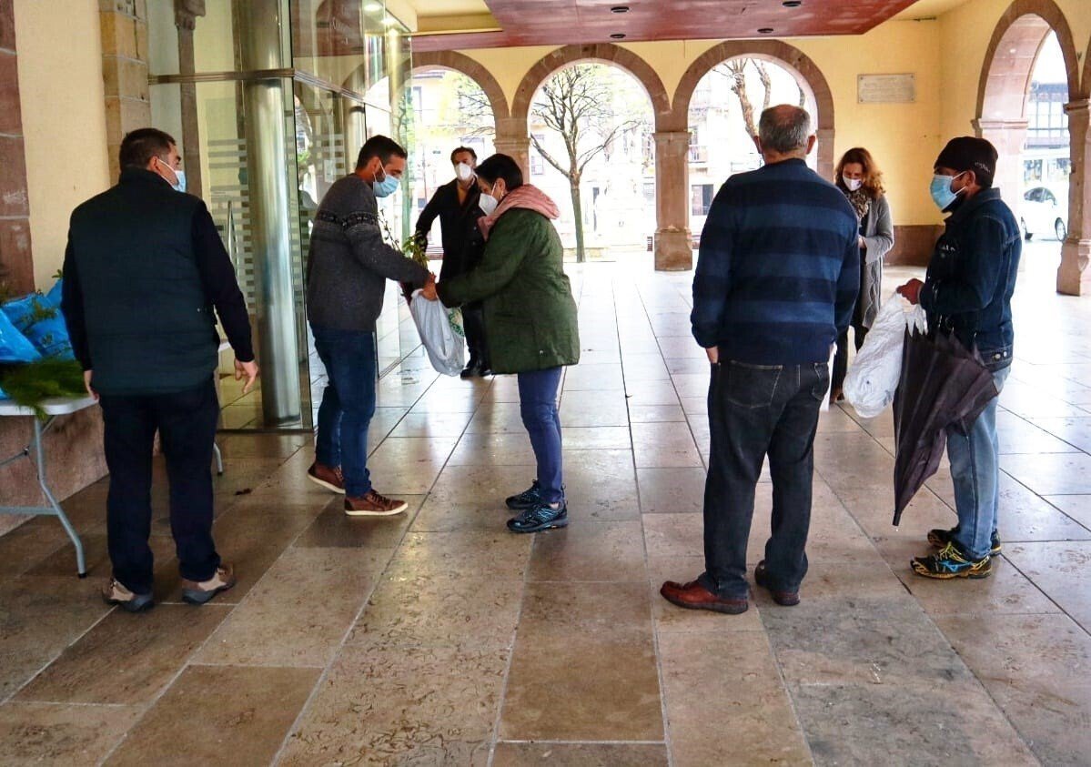 El reparto se realizó en los soportales del Ayuntamiento, cumpliendo con los protocolos marcados por Sanidad, y los vecinos han podido elegir entre manzanos silvestres, perales silvestres, castaños y pinos marítimos, con un porte aproximado de entre 10 y 40 centímetros de altura.