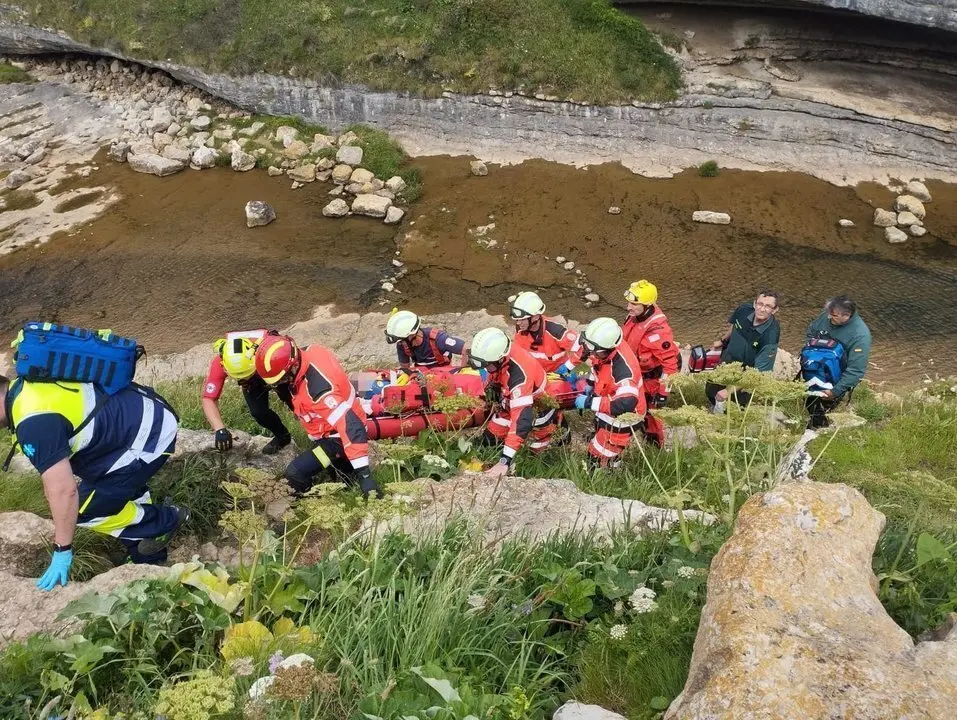 Los efectivos desplazados por tierra han procurado una primera atención al herido hasta la llegada del helicóptero, que tomó tierra en las proximidades. Al grupo se unieron el rescatador y el médico y, después de estabilizar al herido, junto con los bomberos le portearon hasta la aeronave para su traslado aéreo a Santander.
