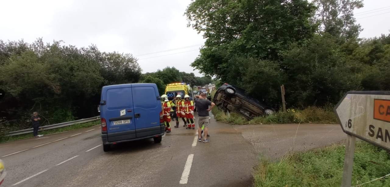 Bomberos de Cantabria han rescatado esta tarde a los ocupantes de un turismo que han quedado atrapados en su interior tras colisionar con una furgoneta en la carretera autonómica CA-131 en Ruiloba y quedar volcado en el talud.