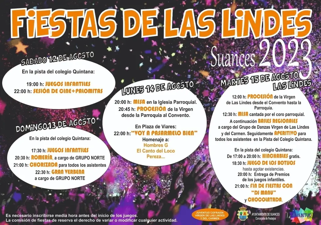 El día grande, el martes 15, festividad de la Virgen de Las Lindes, la jornada incluirá actos religiosos, acompañados por el coro parroquial y la procesión, bailes regionales e hinchables, entre otras propuestas. Las fiestas se cerrarán con la actuación del DJ Manu y chocolatada.