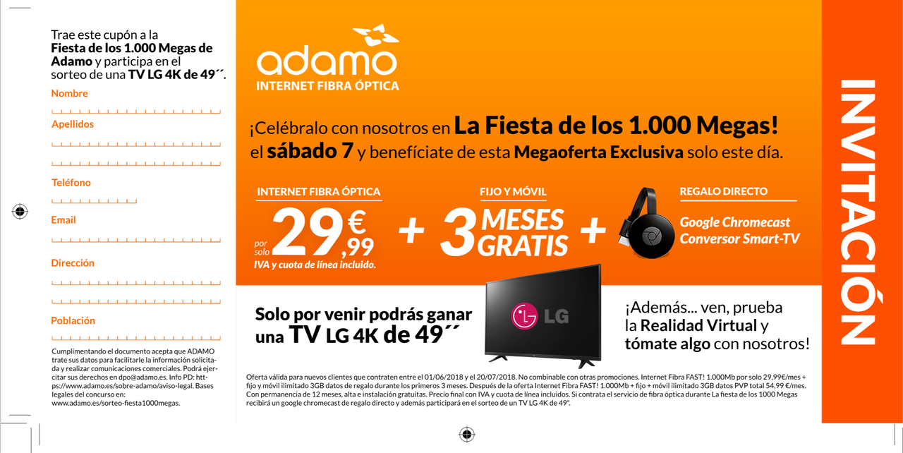 Además, todos los asistentes podrán contratar en la fiesta con una oferta exclusiva, podrán beneficiarse de un precio especial durante 3 meses y contratar la fibra 1.000 megas por solo 29,99/mes + fijo y móvil gratis, además se llevarán un Chromecast de regalo directo.