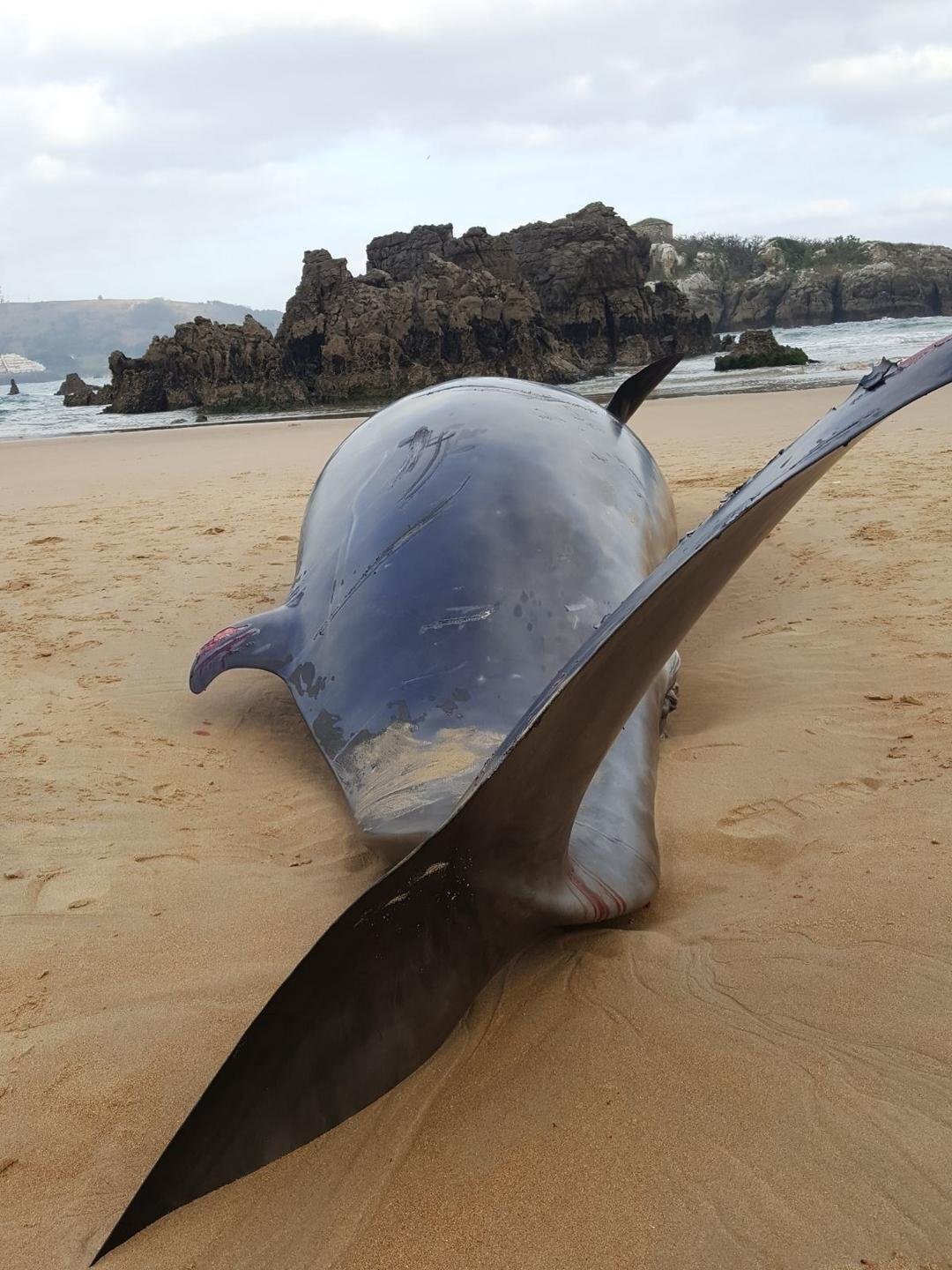Un zifio de cinco metros y medio de longitud apareció muerto este lunes por la mañana en la playa de Ris, de Noja, después de que la marea lo arrastrara hasta el arenal y sin que por el momento se sepan las causas de su fallecimiento.