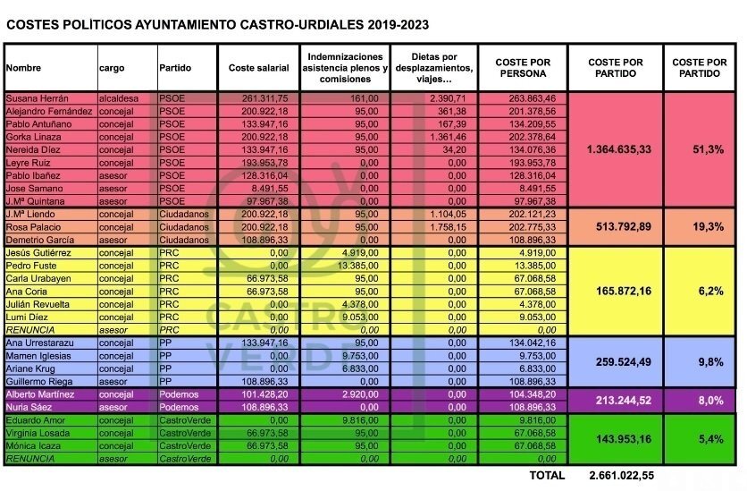 Según los datos que CastroVerde, partido de la oposición, ha recopilado desde el inicio de la legislatura con información que, según ha dicho, "solo se puede encontrar internamente en el Ayuntamiento" --y que según ha dicho debería estar publicada en el Portal de Transparencia Municipal--, de los más de 2,66 millones gastados hasta la última nómina de abril 2,59 se corresponden a sueldos de concejales y asesores; 62.000 euros a dietas de ediles sin sueldo, y 7.000 a gastos de viajes.