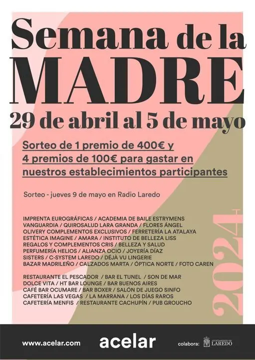 La Asociación de Comerciantes y Empresarios de Laredo (ACELAR) celebrará del 29 de abril al 5 de mayo la Semana del Día de la Madre, a la que están adheridos 37 establecimientos de comercio y hostelería que repartirán de forma gratuita entre sus clientes papeletas para participar en un sorteo.