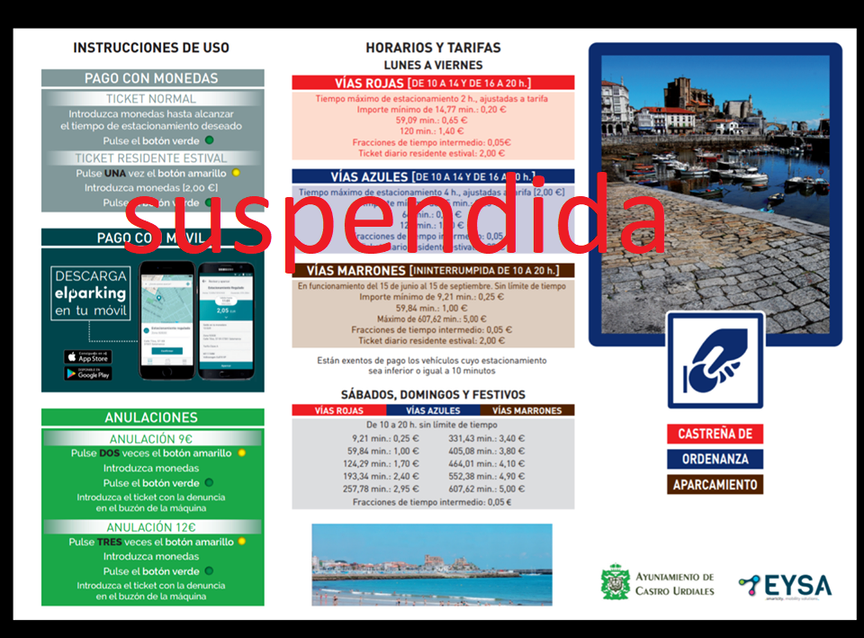 El Ayuntamiento de Castro Urdiales ha suspendido "hasta nuevo aviso" el servicio de estacionamiento regulado (OCA) como medida preventiva para evitar la propagación del coronavirus, facilitando que los vecinos se queden en casa y no tengan que salir a cambiar el tique del parquímetro.