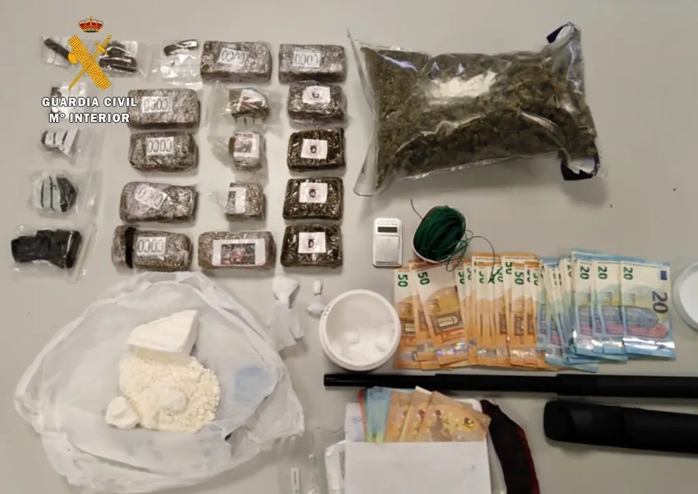En estos registros se intervino más de 2,5 kilos de sustancia de corte, casi 4.500 euros, efectos para la dosificación de estupefacientes, así como diferentes cantidades de cocaína, marihuana y hachís, dispuesto en dosis y preparados para su distribución.