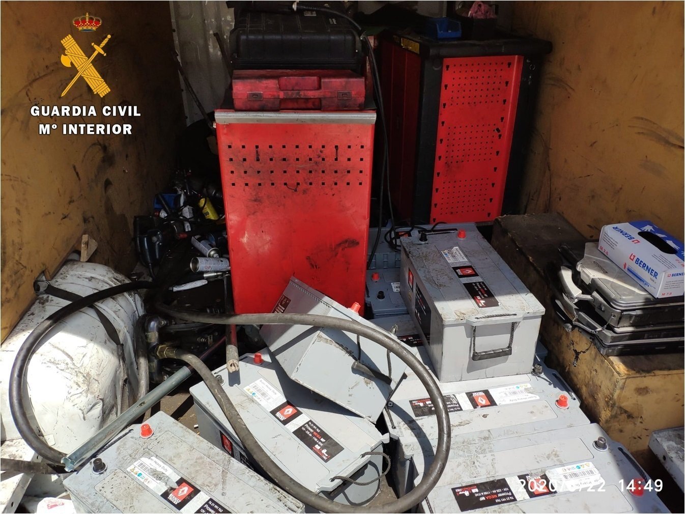 En el interior del vehículo, se almacenaban nueve baterías de camión, cinco armarios de herramientas de distintas marcas, una bomba de trasvase de gasoil, tres equipos de diagnóstico y otro material para diagnosis, dos taladros, una amoladora de 230 mm, tres taladros atornilladores neumáticos y otro de grandes dimensiones para camión.