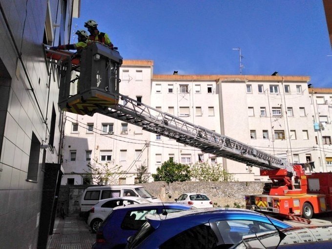 Ante la dificultad de realizar el traslado en camilla por la escalera, los bomberos tuvieron que emplear la autoescala para evacuarla a través de una ventana.