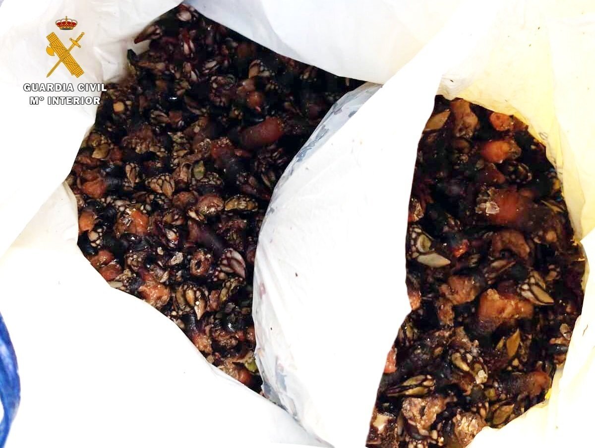 Los guardias inspeccionaron el lugar y encontraron, oculta entre unos arbustos, una bolsa que contenía dos rajadas y una importante cantidad de percebes, entre otros efectos.