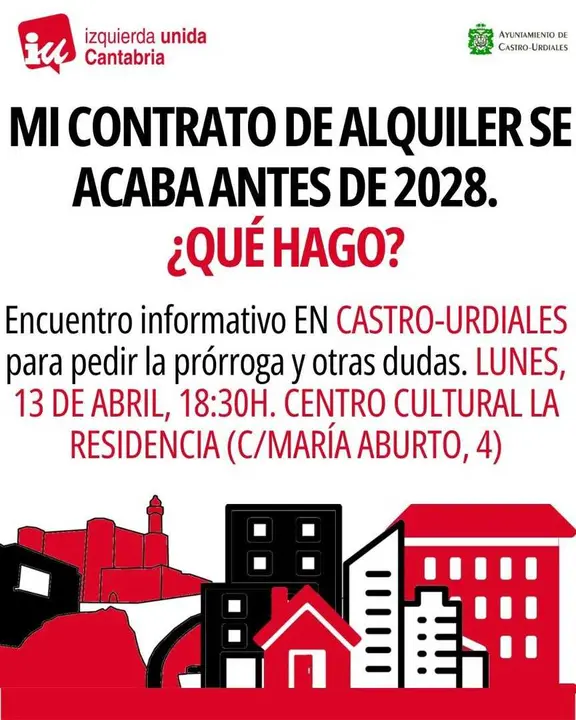Izquierda Unida continuará este lunes, 13 de abril, en Castro Urdiales su campaña informativa sobre el decreto de alquileres, una iniciativa con la que la organización está recorriendo distintos municipios para explicar cómo afecta la normativa a los inquilinos y resolver dudas sobre su aplicación.