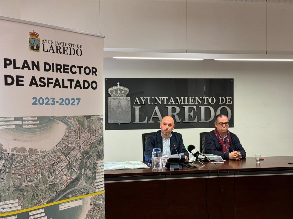 El alcalde de Laredo, Miguel González, y el concejal de Obras, Benito Ortiz, han presentado este martes en rueda de prensa el Plan Director de Asfaltado.