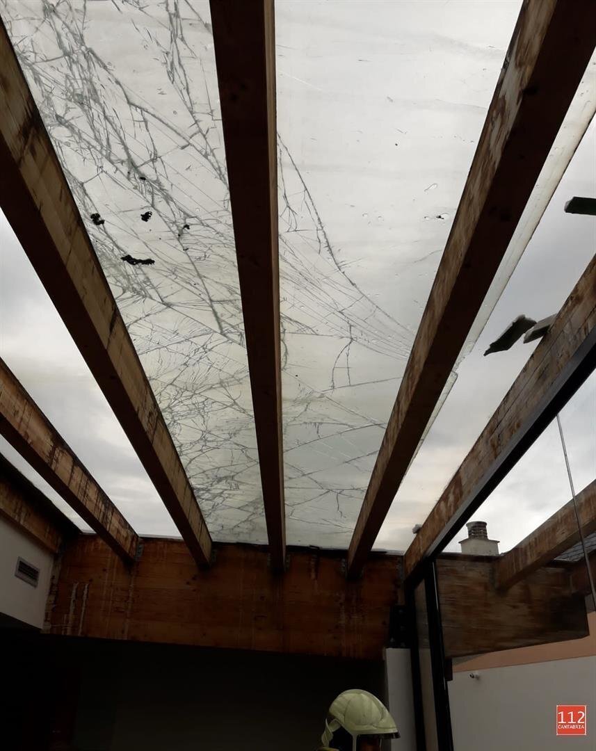 El cristal se ha desplazado y roto por el viento. Los bomberos han retirado la luna, por trozos, desde el tejado gracias a la autoescala. En la actuación ha intervenido también la Policía Local de Arnuero.