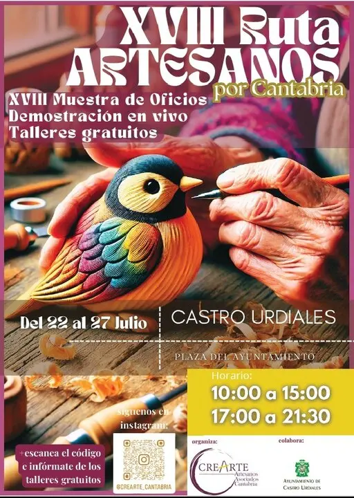 Castro Urdiales acogerá desde este martes, 22 de julio, al domingo, día 27, la XVIII Ruta Artesanos por Cantabria, que se instalará en la Plaza del Ayutamiento y ofrecerá demostraciones en vivo de los oficios artesanos y talleres infantiles gratuitos.