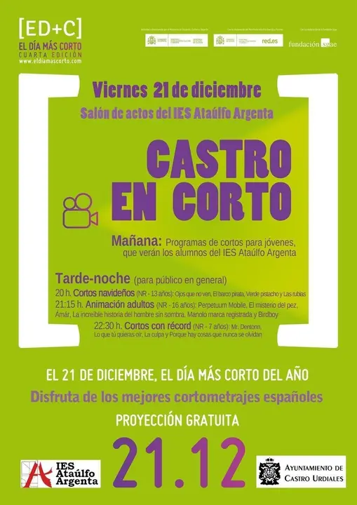 Bajo el título 'Castro en corto', este año se han programado por la mañana varios pases para alumnos del propio IES Ataúlfo Argenta, en su salón de actos (Paseo Menéndez Pelayo, 4). Por la tarde, el mismo lugar acogerá tres programas abiertos al público general, con entrada libre y gratuita hasta completar aforo.