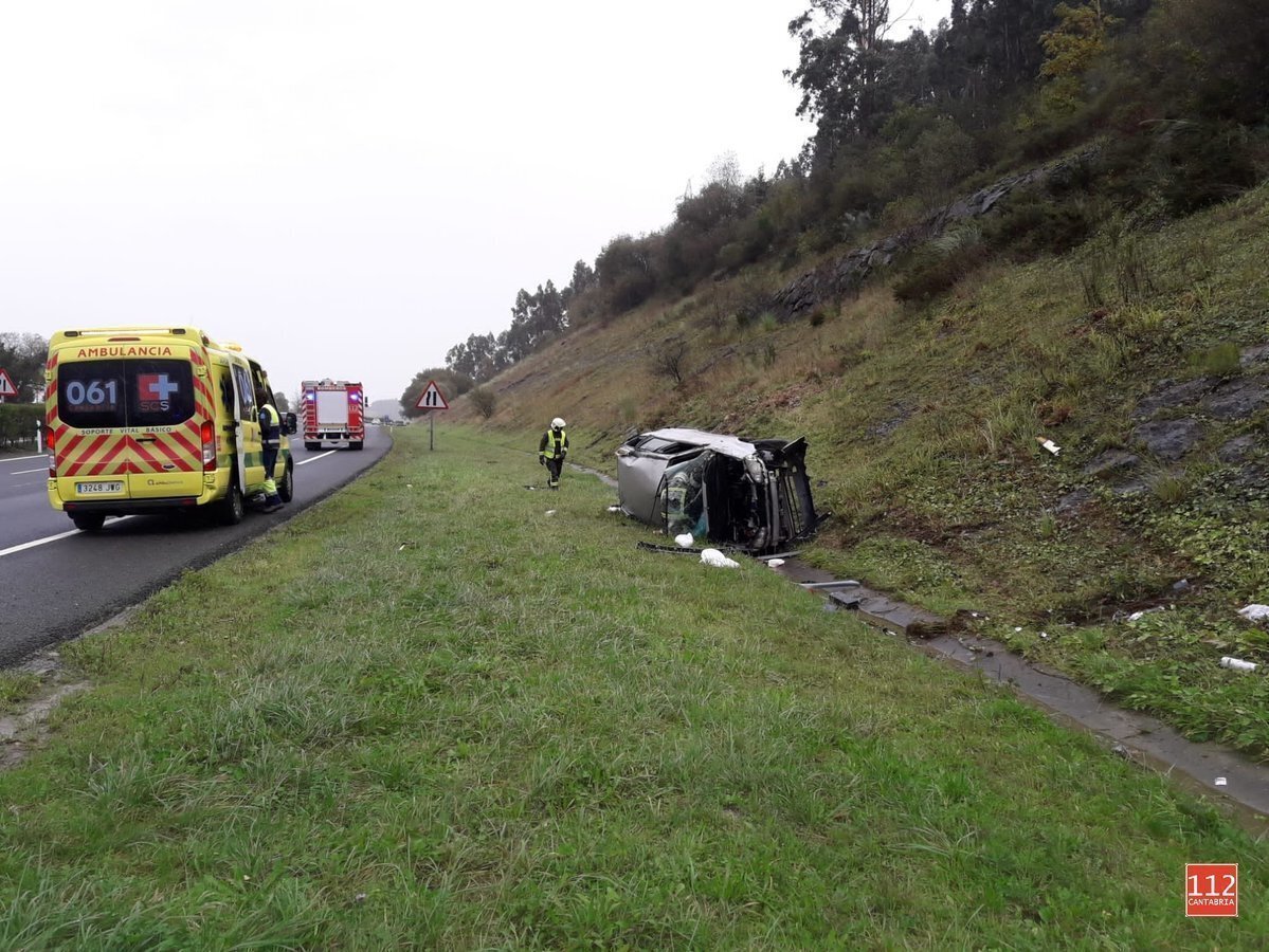 Este mediodía el Centro de Atención de Emergencias del 112 del Gobierno de Cantabria ha recibido el aviso minutos después de las 13:30 horas de un accidente de tráfico con un vehículo volcado contra un talud, que se había salido de la vía en la autovía A-8, en el punto kilométrico 181, a la altura de Bárcena de Cicero.