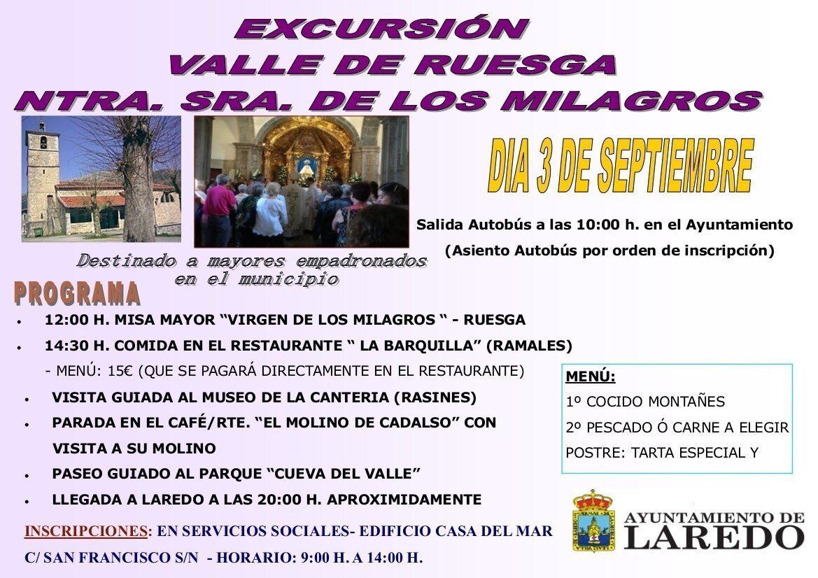 El Ayuntamiento de Laredo, a través de la Concejalía de Servicios Sociales, Turismo y Festejos, ha organizado para este lunes 3 de septiembre, una excursión al Valle de Ruesga.