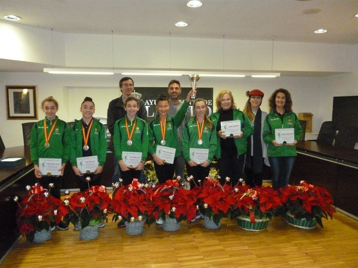 Las integrantes del equipo infantil de la Escuela Municipal de Gimnasia Rítmica de Laredo, de 12 y 13 años, han brindado a su Ayuntamiento el trofeo conseguido el pasado mes en Alicante que les acredita como subcampeonas de España.