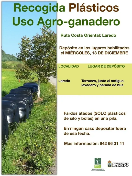 La Mancomunidad de Municipios Sostenibles (MMS) de Cantabria ha programado para este jueves 14 una recogida de plásticos de uso agroganadero en la localidad de Tarrueza (Laredo), junto al antiguo lavadero y parada de autobús, para su transporte a la planta de tratamiento de residuos de Meruelo.