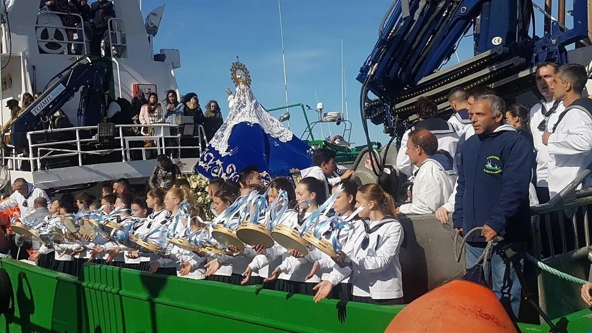 Bajo los acordes del himno nacional, tocados por la Banda de Cornetas y Tambores de San Vicente, la imagen de la Virgen fue embarcada en el pesquero 'Siempre Santa María', momento cumbre de esta fiesta que fue recibido con muestras de alegría por el resto de las embarcaciones del puerto barquereño, haciendo sonar sus sirenas al mismo tiempo que se lanzaron cientos de cohetes al aire.
