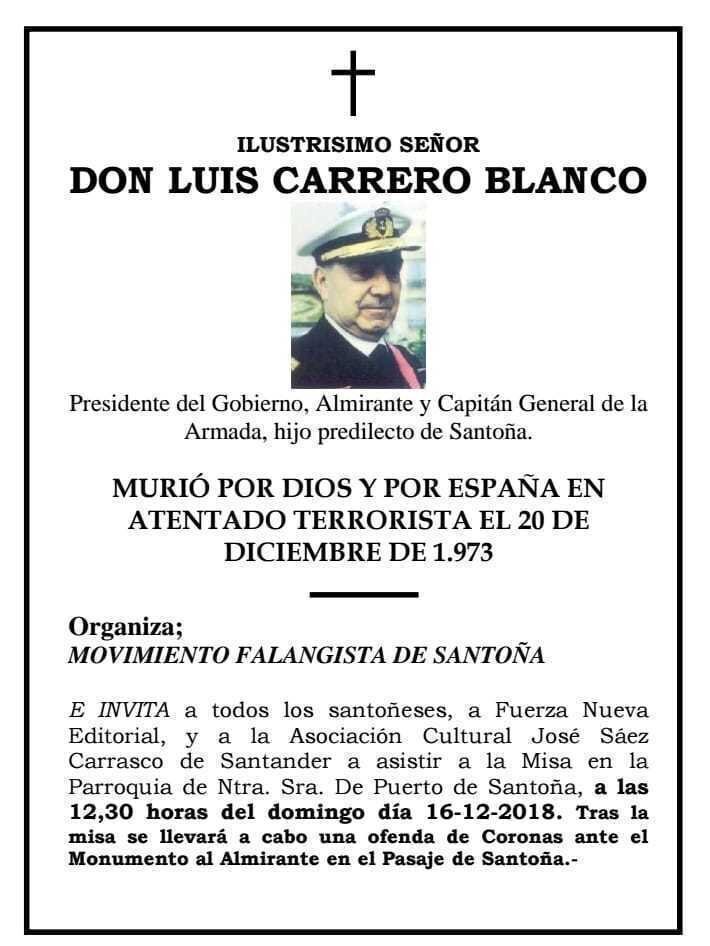 Un año más, Santoña celebrará este domingo día 15 el homenaje a Carrero Blanco (Santoña, 1904), quien fuera Presidente del Gobierno de España e hijo predilecto de la villa, asesinado por ETA el 20 de Diciembre de 1973.