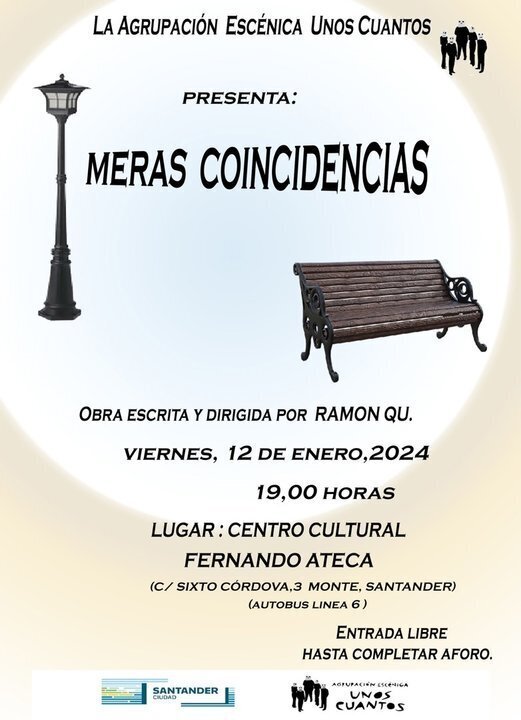 El centro cultural Fernando Ateca de Santander acogerá este viernes, 12 de enero, la representación teatral 'Meras Coincidencias', de la Agrupación Escénica 'Unos Cuantos'. Será a las 19.00 horas, con entrada libre hasta completar aforo.