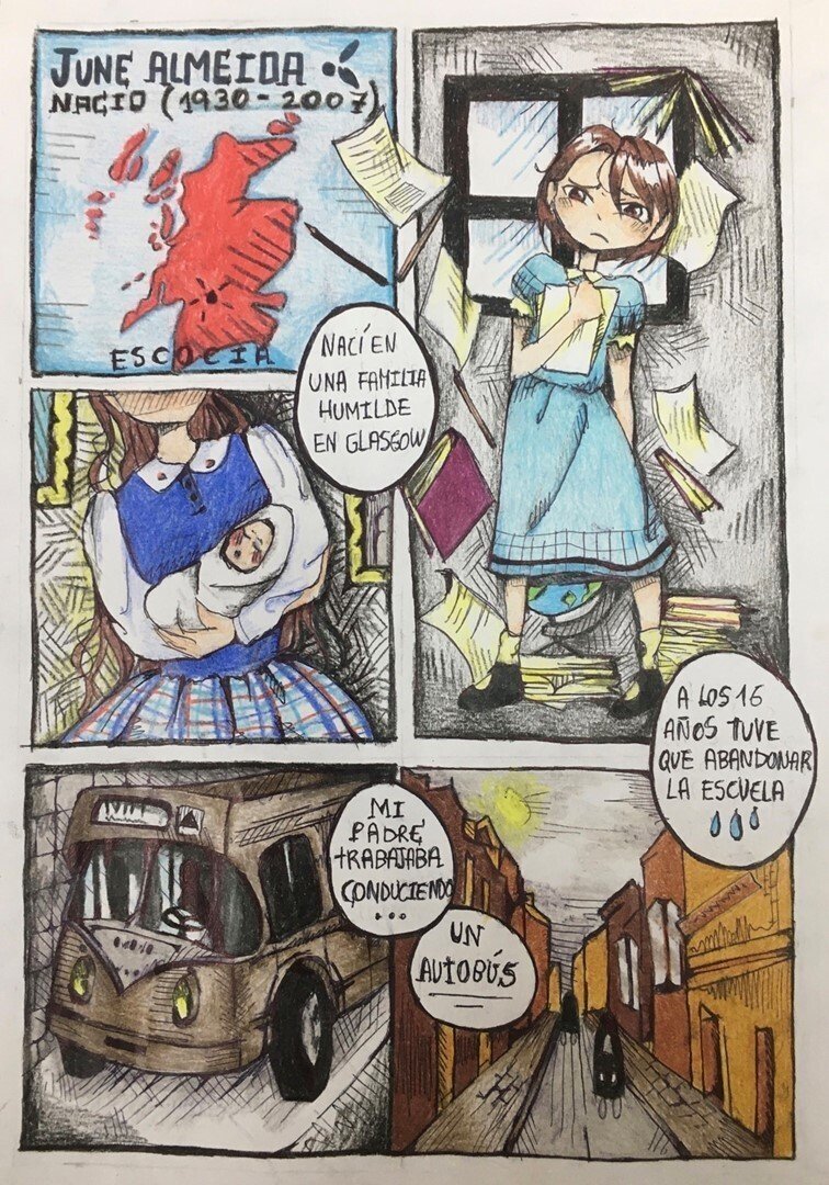 Julieta Halicki y Santiago Quiceno han logrado los dos primeros premios narrando en dos estilos totalmente diferentes la historia de June Almeida, un trabajo propuesto por su profesora de Educación Plástica, Marian Gómez, y que hicieron unos 70 estudiantes del Instituto Ataúlfo Argenta.