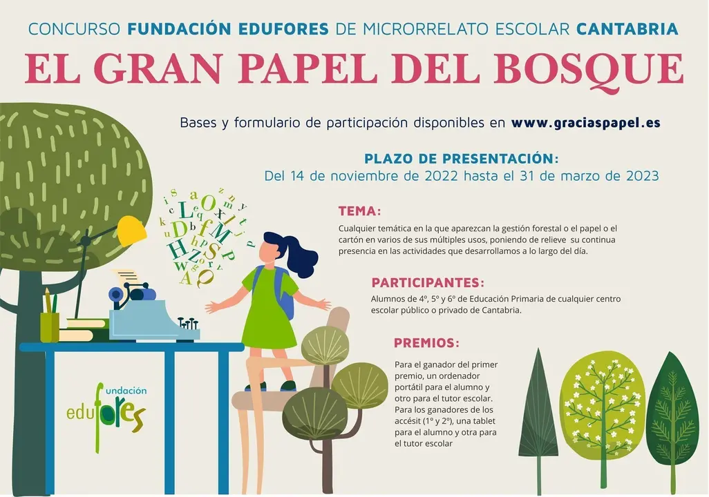 La Fundación Edufores ha convocado el concurso de microrrelato escolar 'El gran papel del bosque', destinado a alumnos que cursen 4º, 5º y 6º de Educación Primaria en cualquier centro escolar público o privado de Cantabria.