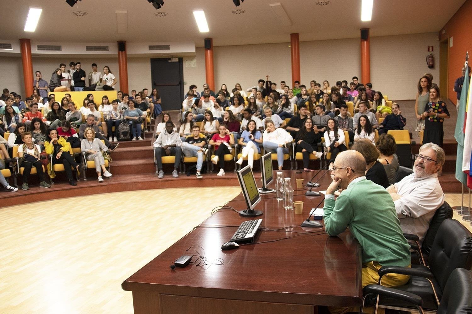 Cientos de estudiantes de Secundaria de toda Cantabria llenaron el Aula Magna, donde también tomaron la palabra Juan Herrera, coordinador del grupo Amnistía Internacional en Cantabra y Fuencisla Cuesta, responsable de Centros Educativos en la carrera 'Santander corre por el Yemen'.