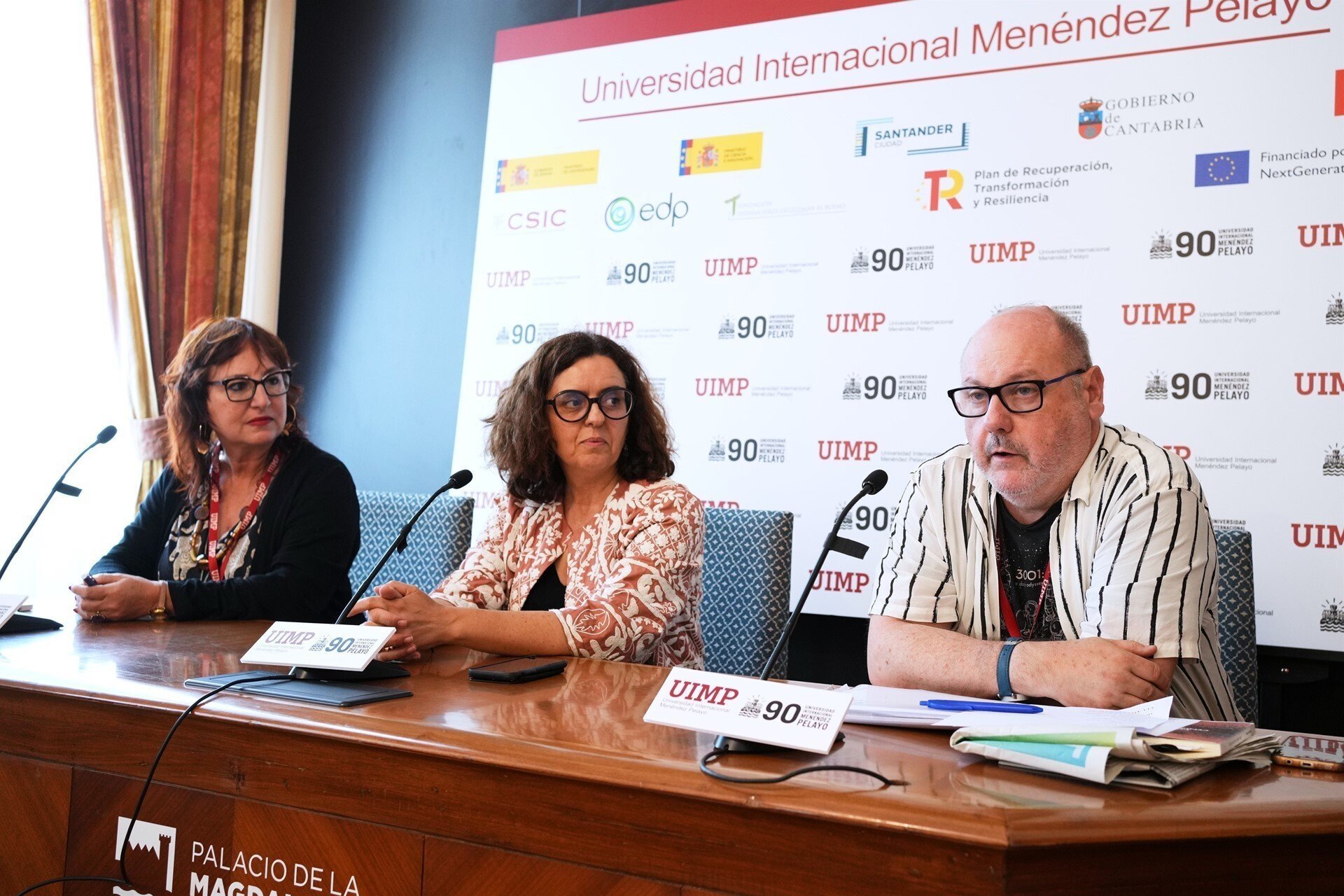 Agur ha ofrecido este martes una rueda de prensa en la UIMP con motivo del arranque de los 'Martes literarios', acompañada por la vicerrectora de Relaciones Institucionales y Programación de Actividades, Matilde Carlón, y el periodista Guillermo Balbona, de El Diario Montañés, que se alternará con el poeta Regino Mateo en las presentaciones del ciclo un año más.