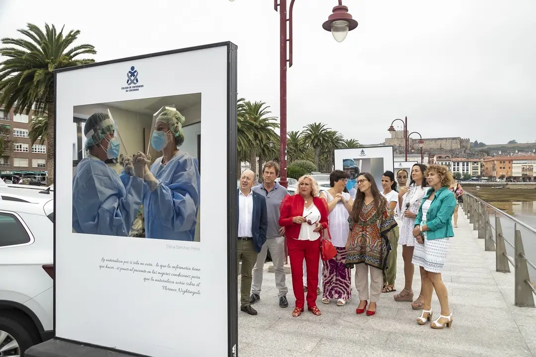 La exposición itinerante 'Miradas enfermeras de la pandemia', compuesta por 9 tótems que muestran las fotografías, se ha inaugurado este viernes en la avenida Miramar de San Vicente de la Barquera, donde podrá verse hasta el 24 de agosto.