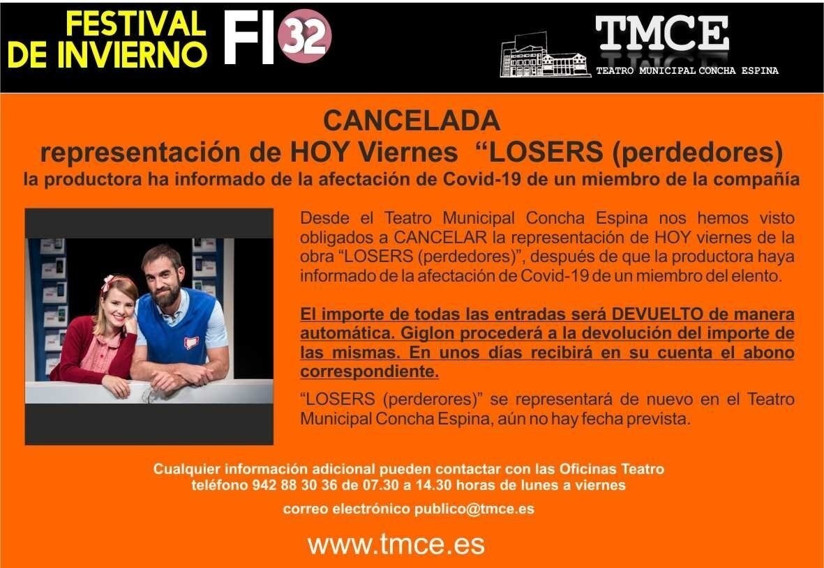 La obra de teatro 'Losers' (Perdedores) que iba a representarse este viernes, día 12, a las 20 horas, en el Teatro Municipal Concha Espina de Torrelavega, dentro de la programación del Festival de Invierno, se ha cancelado por motivos relacionados con el Covid.