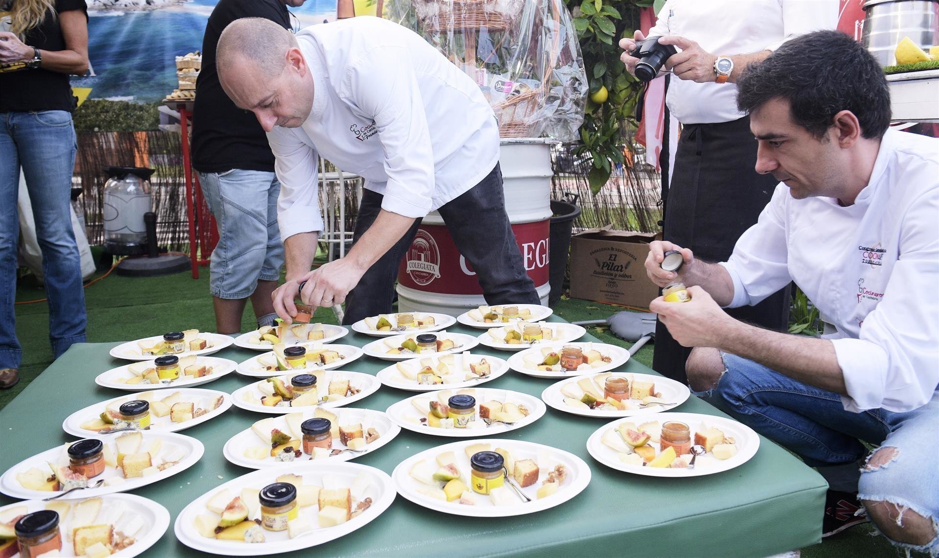 Los cocineros Floren Bueyes y Óscar Solana participan este viernes en la última cita de los retos gastronómicos y solidarios del Festival Intercultural de las Naciones, celebrados en el stand de Cervezas Colegiata y que han sido una de las novedades de esta edición.