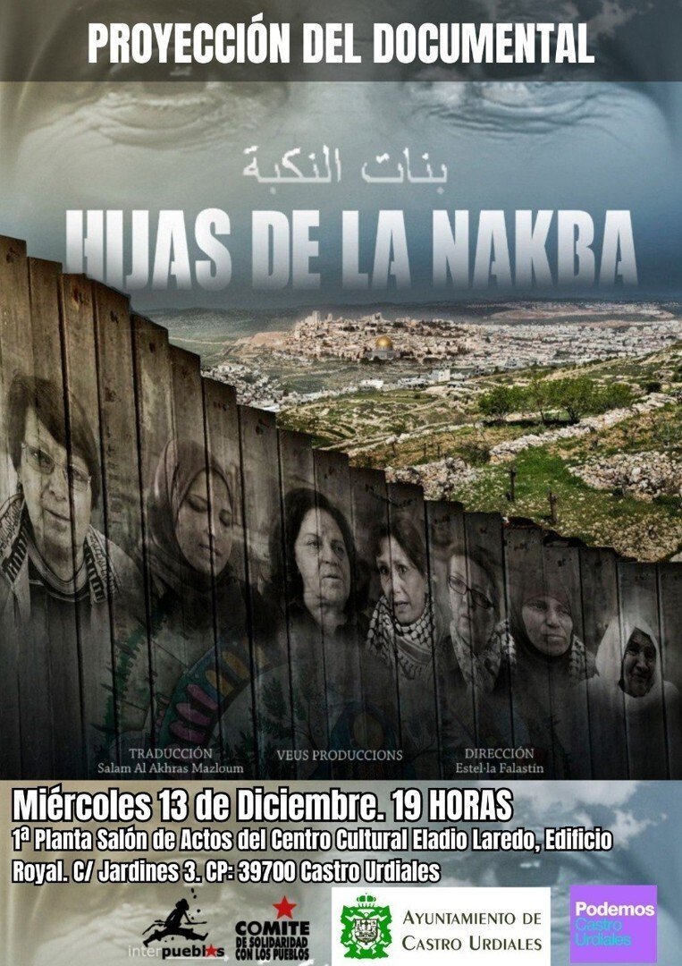 A la misma hora, pero en el salon de actos del Centro Cultural Eladio Laredo de Castro Urdiales, se proyectará el documental 'Las hijas de la Nakba', que recoge las fechas y sucesos más significativos que han afectado al territorio palestino en el último siglo, y de qué forma las mujeres han participado y han estado presentes en todas las formas de lucha y resistencia.