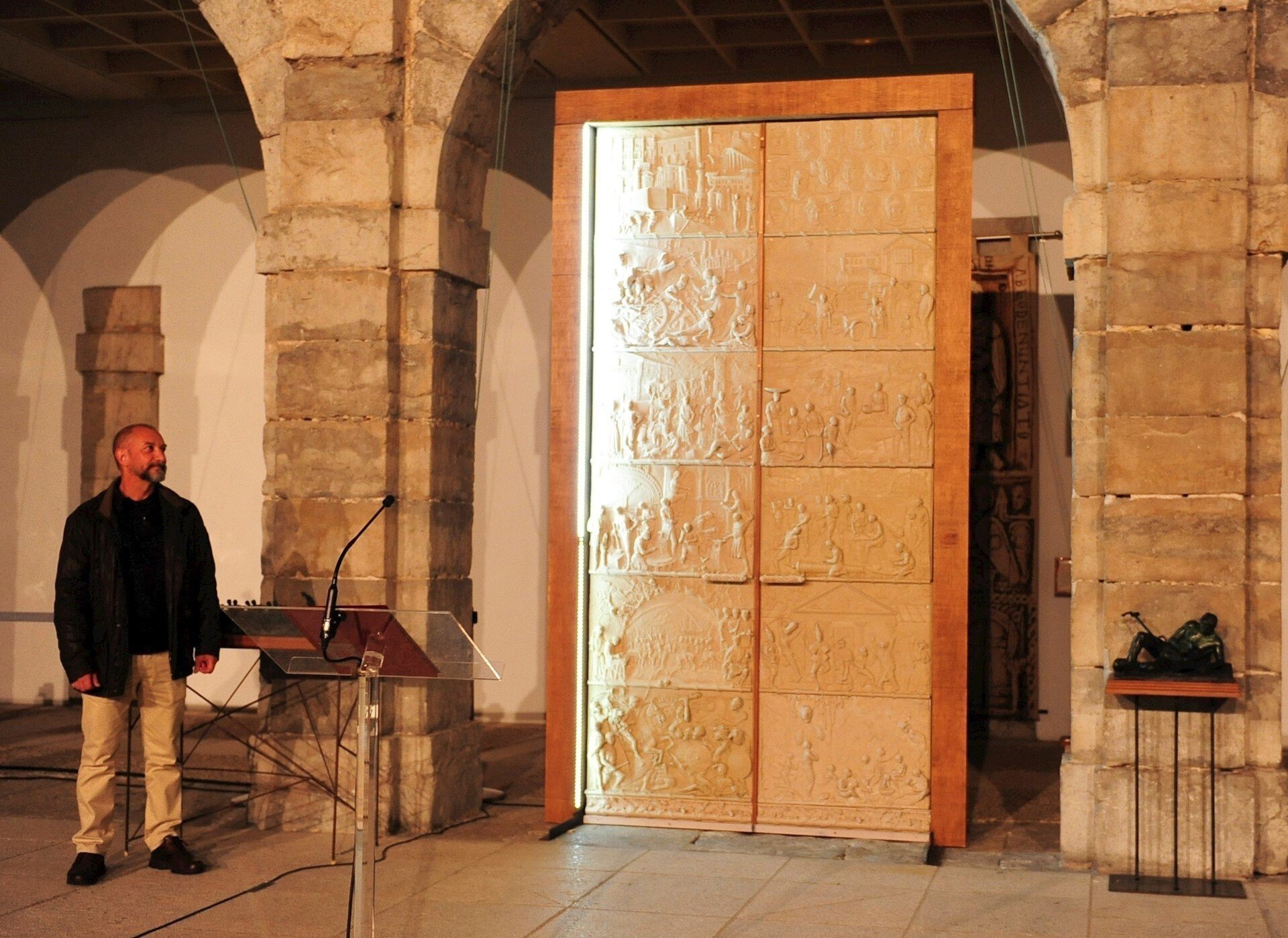 Se trata de una pieza escultórica de grandes dimensiones -tres metros de alto por dos de ancho- que representa acontecimientos y momentos de la historia de la comunidad, desde la prehistoria a la actualidad, a través de doce paneles distribuidos en dos hojas historiadas y un zócalo.