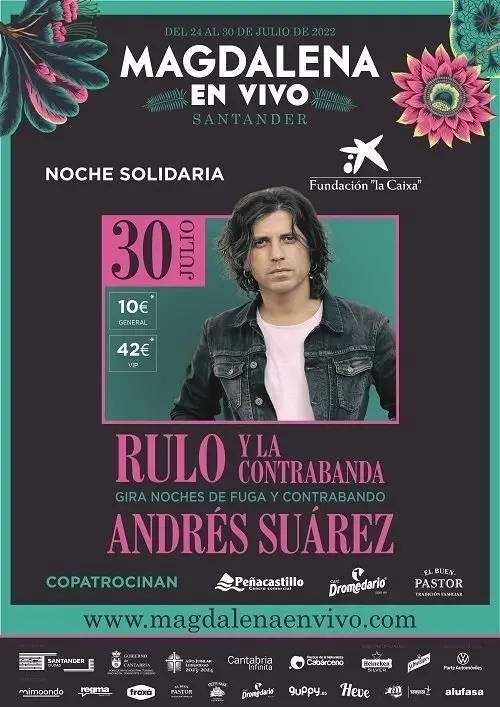 La Noche Solidaria de Rulo y La Contrabanda y Andrés Suárez se encuadra dentro de la programación del festival Magdalena en Vivo 2022, que se celebrará coincidiendo con las fiestas de la Semana Grande de Santander e incluirá también las actuaciones de Maluma el 24 de julio, Simple Minds y MClan el 26 de julio, y Dani Martín y Marlon el 28 de julio.