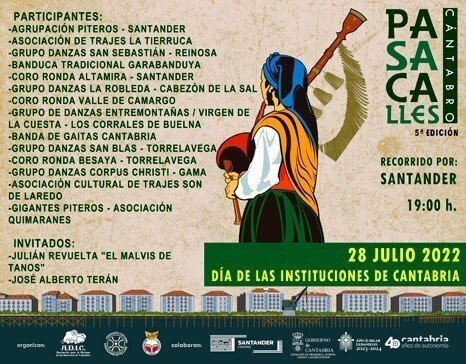Participarán en el pasacalles la agrupación de piteros de Santander, la Asociación de Trajes La Tierruca; el Grupo de Danzas San Sebastián de Reinosa; el Coro Ronda Altamira de Santander; la Agrupación de Danzas La Robleda de Cabezón de la Sal; el Coro Ronda Valle de Camargo; el Grupo de Danzas Entremontañas-Virgen de la Cuesta de Los Corrales de Buelna; la Banda de Gaitas Cantabria; el Grupo de Danzas San Blás de Torrelavega; el Coro Ronda Besaya de Torrelavega; el Grupo de Fanzas Corpus Christi de Gama; la Banduca Tradicional Garabanduya; la Asociación Cutlural de Trajes Son de Laredo, y Gigantes Piteros-Asociación Quimaranes.