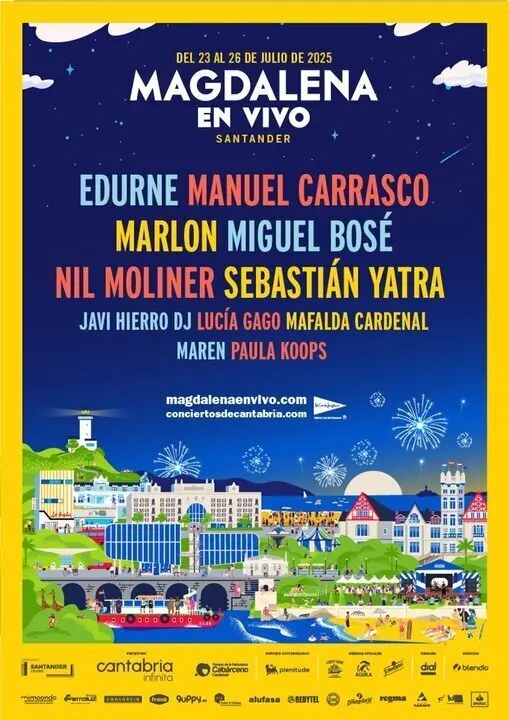 Sebastián Yatra, Manuel Carrasco, Edurne, Miguel Bosé, Nil Moliner y Marlon serán los cabezas de cartel este próximo verano del festival Magdalena en Vivo, que celebrará su quinta edición en la capital de Cantabria entre el 23 y el 26 de julio de 2025 coincidiendo con las fiestas de la Semana Grande de Santander, y que incluirá también las actuaciones de otros artistas como Maren, Mafalda Cardenal, Paula Koops, Lucía Gago o Javi Hierro DJ.