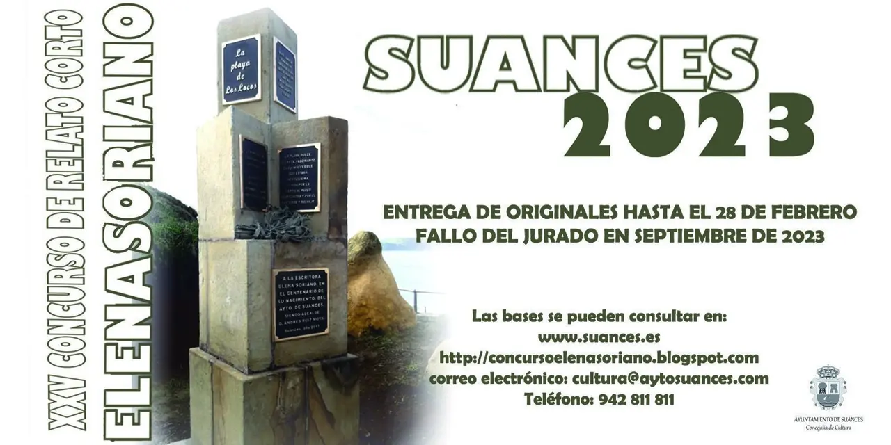 El Ayuntamiento de Suances ha convocado la edición número 25 del Concurso Internacional de Relato Corto Elena Soriano, cuyo plazo de presentación de trabajos permanecerá abierto hasta el 28 de febrero, inclusive.