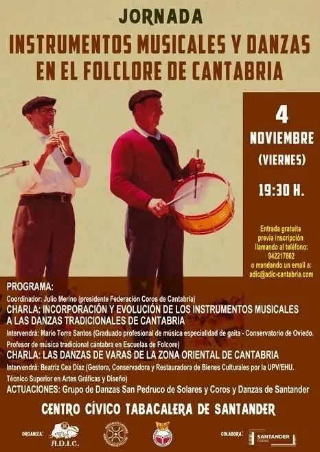 El salón de actos del centro cívico Tabacalera de Santander acogerá el viernes 4 de noviembre una jornada titulada 'Instrumentos musicales y danzas en el folclore de Cantabria', que hará un recorrido por la evolución y la incorporación a lo largo de la historia de los instrumentos musicales más importantes a las danzas tradicionales cántabras.