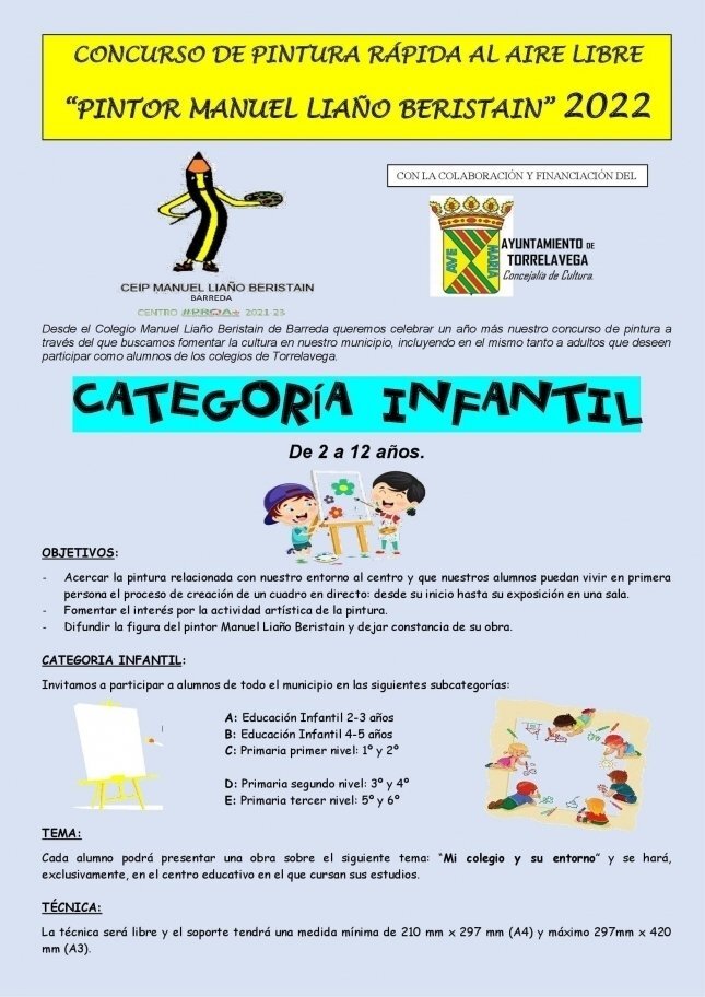 El tema será una reproducción de cualquier rincón del CEIP Manuel Liaño y sus alrededores elegido por los pintores. La técnica será libre, los soportes de las obras preferiblemente bastidores, y tendrán una medida mínima de 65x50 y máxima de 100x100 centímetros.
